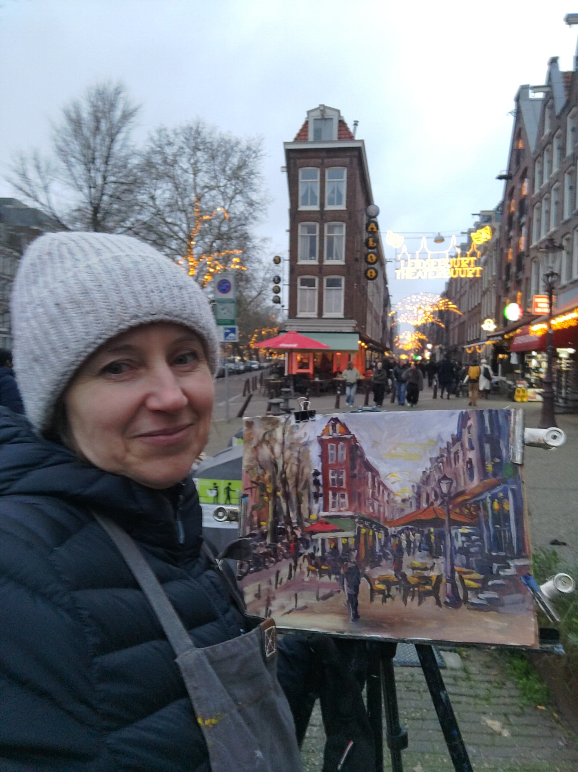 The planned plein air session in pre-Christmas Amsterdam turned out to be very productive. At first, I wanted to paint the ice rink with its Christmas lights and festive atmosphere, but once we arrived, the scene turned out to be very chaotic, so we decided to postpone that idea until better times.