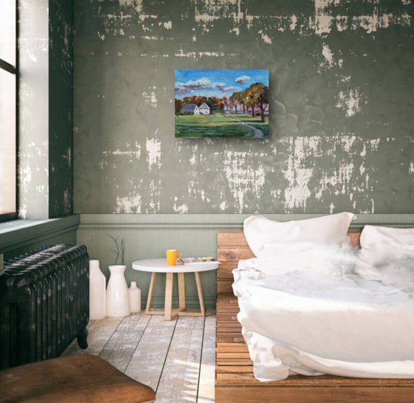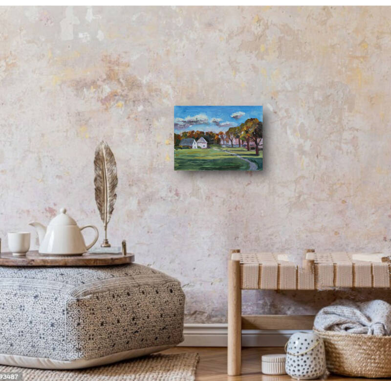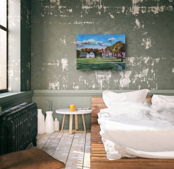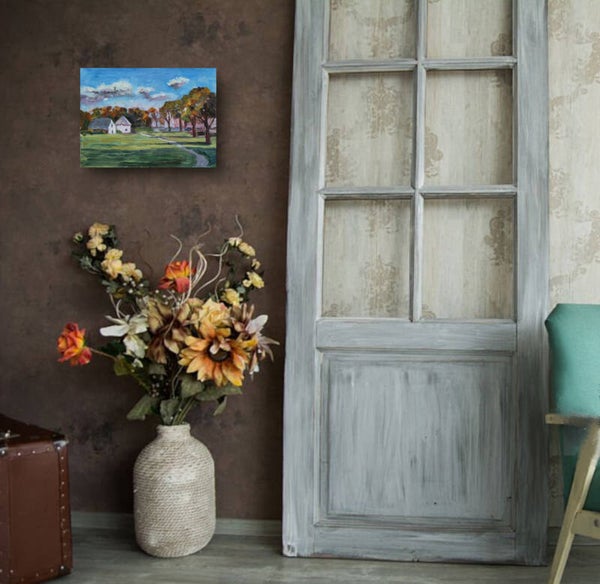 Origineel herfstlandschap in olieverf met een gezellig landhuis en warme tinten. Uniek schilderij van Julia Grechkina voor tijdloze wanddecoratie.